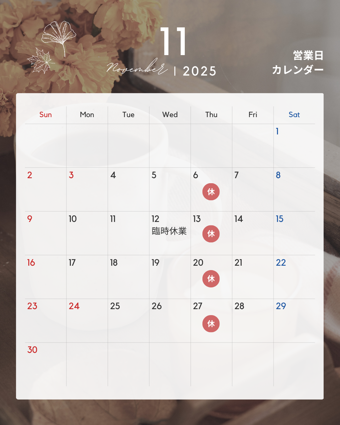 11月の店休日です。